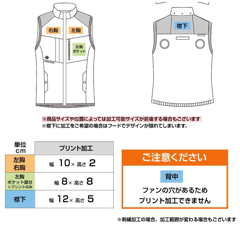 | 仕様 | 大型フードスピンドル付き(ボタン止め脱着仕様)、フードプリント、バッテリー収納ポケット(右・ブロックテーピー止め・コードホール付)※特許取得済、バッテリー収納ポケット(左・ファスナー止め・コードホール付)※特許取得済、ハーネスフックハンガー取付ベルト&取り出し口、内バッテリーポケット(左・ドットボタン止め)、アームハイバックファン※特許取得済、ランヤード取付口※特許取得済、衿ダイレクトエアー※特許取得済 |