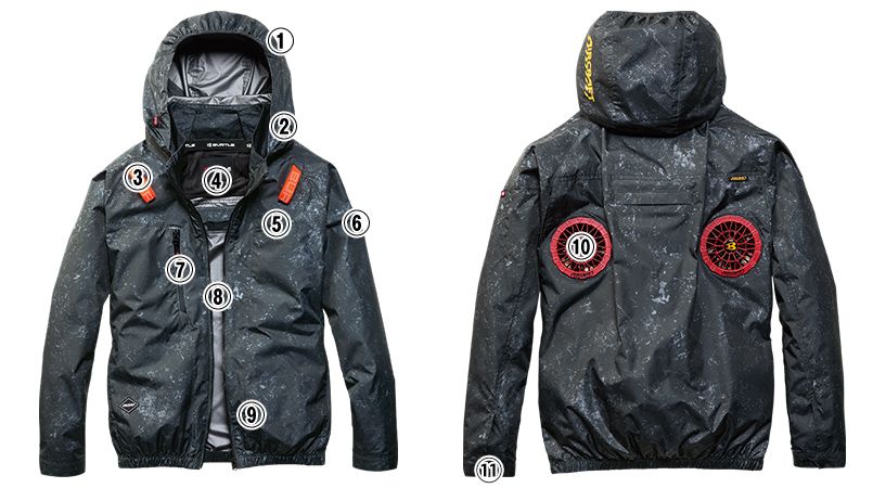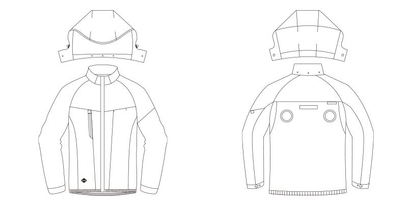 | 仕様 | フードプリント、大型フード スピンドル付き(ボタン止め着脱仕様)、ハーネスフックハンガー取付ベルト&取り出し口、衿ダイレクトエアー、胸ペンポケット、袖ペンポケット、バッテリー収納ポケット(ファスナー止めコードホール付)、コードストッパー(ドットボタン止め)、内バッテリーポケット(マジックテープ止め)、アームハイバックファン、ランヤード取付口、カフスアジャスター、フルハーネスに完全対応 |