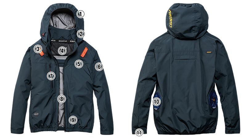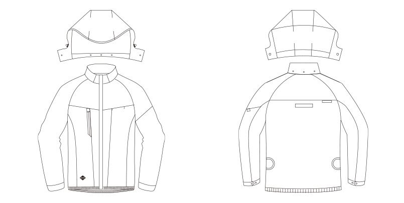 | 仕様 | フードプリント、大型フード スピンドル付き(ボタン止め着脱仕様)、ハーネスフックハンガー取付ベルト&取り出し口、衿ダイレクトエアー、胸ペンポケット、袖ペンポケット、バッテリー収納ポケット(ファスナー止めコードホール付)、コードストッパー(ドットボタン止め)、内バッテリーポケット(マジックテープ止め)、両脇サイドバックファン、内側コードループ付、カフスアジャスター、フルハーネスに完全対応 |