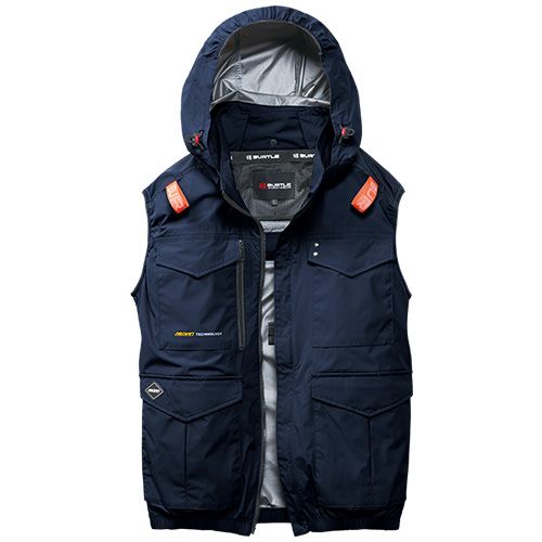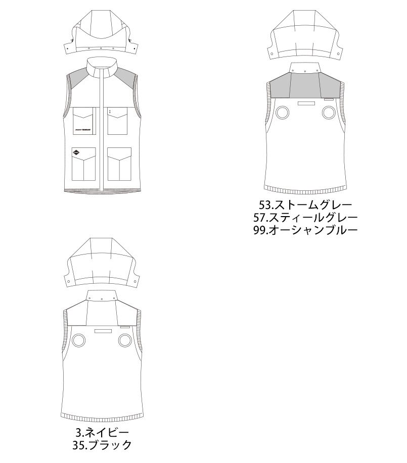 | 仕様 | フードプリント、大型フード スピンドル付き(ボタン止め着脱仕様)、胸ペンポケット、バッテリー収納ポケット(ファスナー止めコードホール付)、コードストッパー(ドットボタン止め)、両脇ポケット、内バッテリーポケット(マジックテープ止め)、アームハイバックファン、フルハーネスに完全対応 |