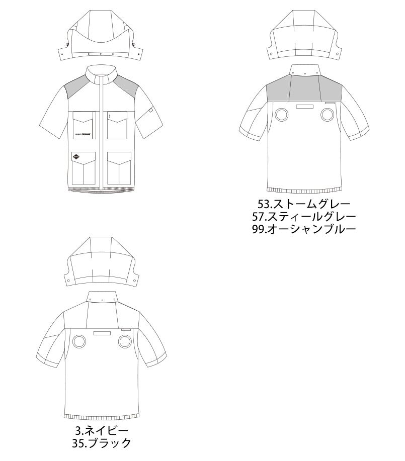 | 仕様 | フードプリント、大型フード スピンドル付き(ボタン止め着脱仕様)、袖ペンポケット、胸ペンポケット、バッテリー収納ポケット(ファスナー止めコードホール付)、コードストッパー(ドットボタン止め)、両脇ポケット、内バッテリーポケット(マジックテープ止め)、アームハイバックファン、フルハーネスに完全対応 |