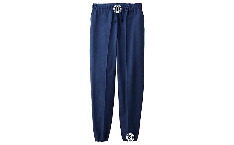 | 仕様 | 斜めポケット、ウエスト総ゴム・ヒモ入り、裾ゴム入り |
