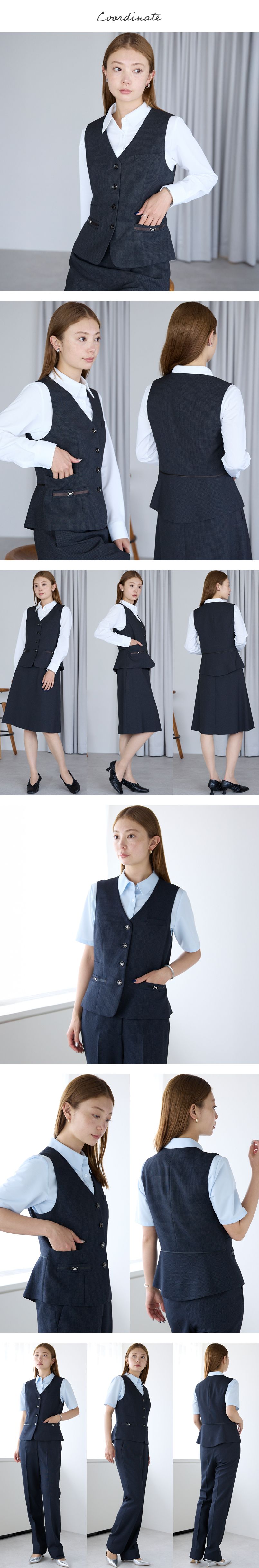 | 仕様 | 後ろ身頃のペプラム&パイピング、右脇スマホポケット、左胸箱ポケット、両脇箱ポケット、エコトピア、オールシーズン、家庭洗濯OK |