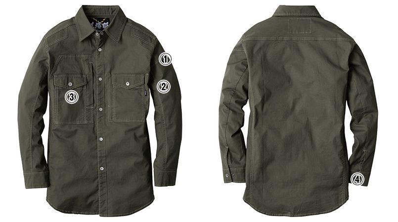 | 仕様 | 左袖ペン差し、動きやすい3Dカット、右胸タテ型ファスナーポケット&フラップ付きポケット、袖口アジャスター付き、左右胸ポケット、金属ファスナー、金属ドットボタン |