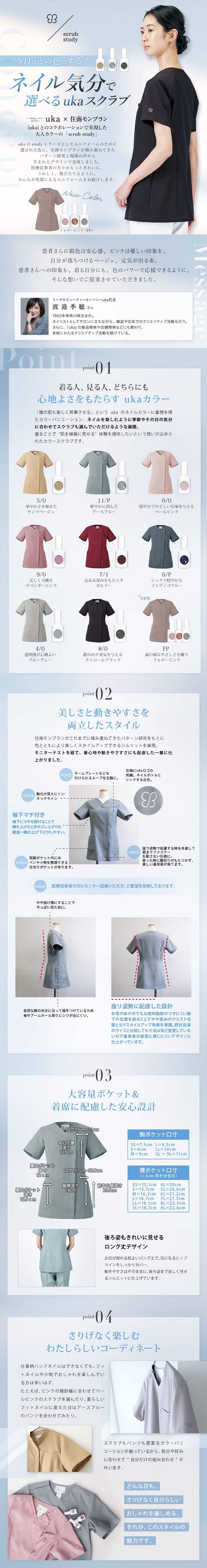 住商モンブランと、トータルビューティカンパニーuka(ウカ)とのコラボレーションで実現した大人カラーの「scrub study(スクラブスタディ)」です。 「誰の肌も美しく昇華させる」というukaのネイルカラーに着想を得たカラーバリエーション。 ネイルを楽しむように季節やその日の気分に合わせてスクラブも選んでいただけるような8色展開です。 着ることで”肌を綺麗に見せる”体験を提供したいという想いが込められたカラースクラブです。 また、住商モンブランがこれまでに積み重ねてきたパターン研究をもとに色とともにより美しくスタイルアップできるシルエットを実現しました。 着心地や動きやすさにも配慮した一着です。左袖にはネイルボトルとリンクする白色ukaロゴの刺繍があしらわれています。 軽やかに澄んだ印象のアースブルー、シックで穏やかなインディゴブルー、美しく可憐なラベンダーピンク、華やかさを秘めた印象のサンドベージュ、透明感が心地よいブルーグレー、品ある深みをもたらすボルドー、淡くやさしい印象のペールピンクの7色展開です。