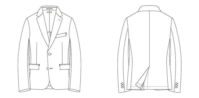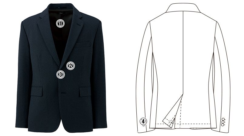 | 仕様 | ホームクリーニング、水牛調ボタン、背抜き仕様、左胸ポケット、内ポケット3コ、両腰ポケット、袖あき見せ仕様、制電ストレッチ裏地 |