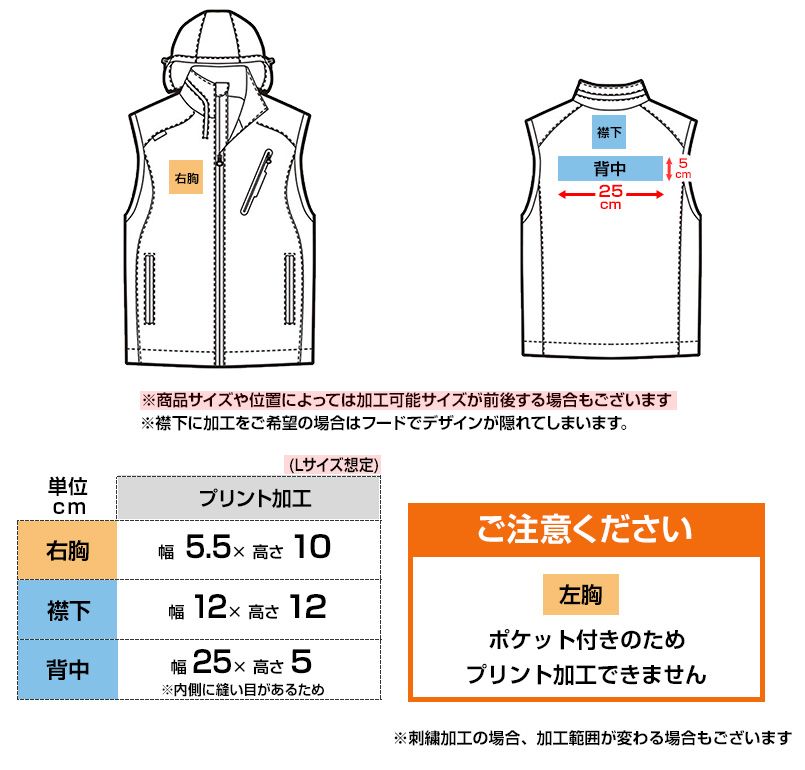 フードイン中綿ベスト(男女兼用)のサイズ表