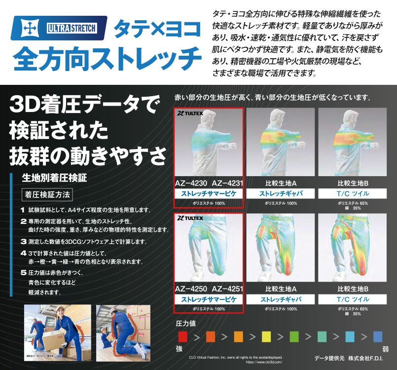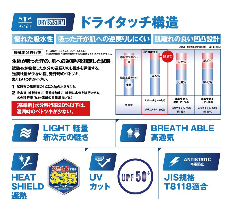 ストレッチ、JIST8118適合帯電防止、吸水速乾、軽量素材、通気性