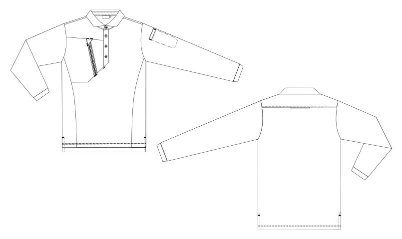 | 仕様 | 前立て長め、左袖ペン差し、右胸反射パイピング、右胸大容量ファスナーポケット、脇スリット、背中反射パイピング、JIST8118適合帯電防止、ストレッチ、吸汗速乾、UVカット、遮熱 ドットボタン:プラスチック ポケットファスナー:コイル(スライダー:ブラック) |