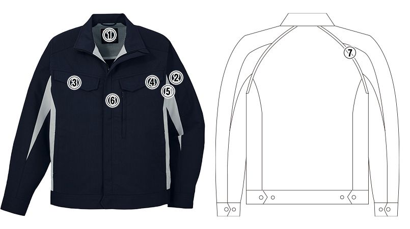 | 仕様 | 背ネーム、左袖ペン差し、携帯電話収納ポケット、ワンポイント、消臭&抗菌テープ、内ポケット、反射パイピング、JIST8118適合、帯電防止素材、ストレッチ、エコマーク、グリーン購入法、PLANTPET®、野帳対応 |