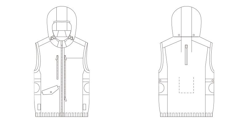 | 仕様 | 首元調整紐、左胸大型収納ポケット (内側ポケット付き)、左内側バッテリー専用ポケット、ワンポイント、ランヤードフックかけベルト、ロゴ入りテープ、ランヤード取付口、保冷剤用メッシュポケット、ケーブル通しループ、フードパンチング仕様、ファン脱落防止メッシュ、サイドファンタイプ、遮熱、UVカット、UPF50+、撥水、野帳対応、取り外し式フード(ボタン)、フルハーネス対応 |