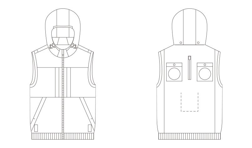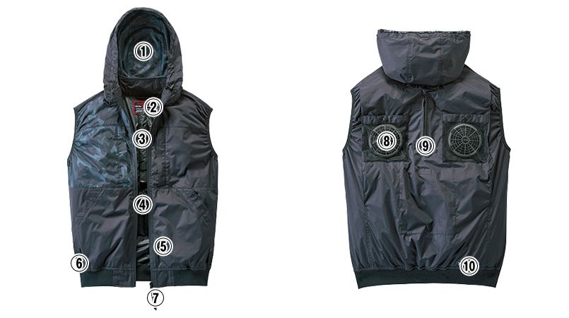 | 仕様 | フード裏カモフラメッシュ、首元調整紐、ランヤード取付口、保冷剤用メッシュポケット、バッテリー専用ポケット、ランヤードフックかけベルト、ロゴ入り引手、ファン脱落防止メッシュ、反射プリント、ハイバックタイプ、遮熱、UVカット、UPF50+、撥水、野帳対応、取り外し式フード(ボタン)、フルハーネス対応 |