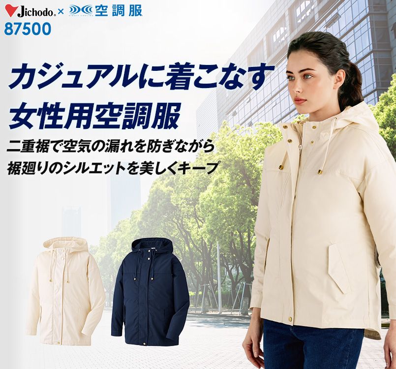 自重堂87500のレディース空調服。女性専用の長袖タイプでカジュアルにも着こなしできるデザイン。ウェア内の二重裾で空気の漏れを防ぎながら裾廻りのシルエットを美しくキープ。