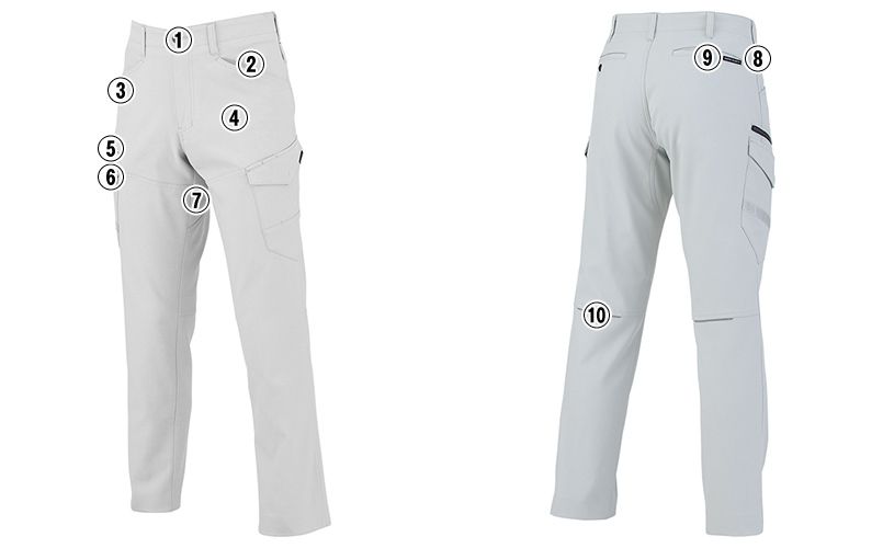 | 仕様 | フロント持ち出し仕様、大容量ポケット、両脇コインポケット付、日本製ストレッチ素材、右サイドファスナーポケット、上から入るスマホポケット、クライミングカット、両脇カラビナループ付、反射素材、ボタン・カーゴポケット樹脂製、前立金属製、JIS T8118適合、帯電防止、ノータック |