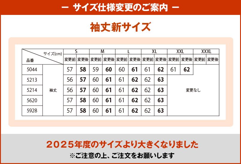 | 袖丈 | 58 | 60 | 61 | 62 | 64 | |