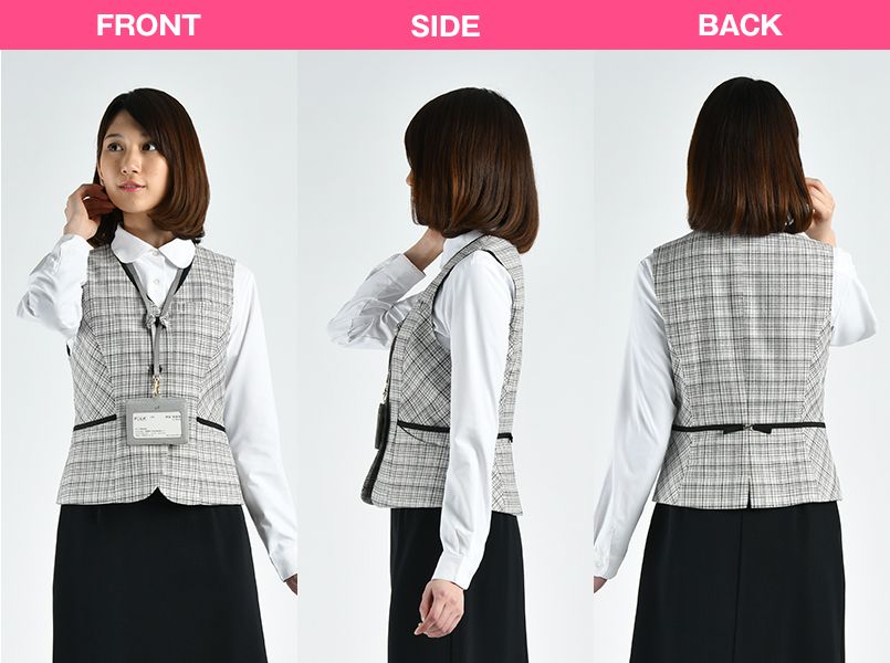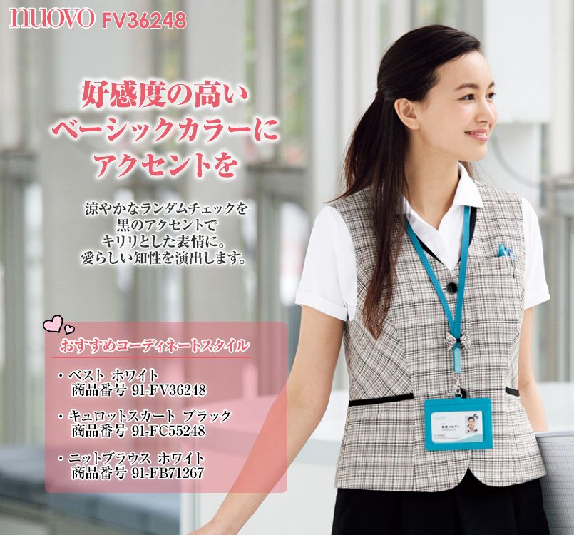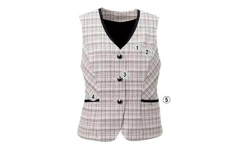 FLOKのnuovo(ヌーヴォ)FV36248のベスト。好感度の高いベーシックカラーにクラクラのラメの縁取りボタンがアクセントに。涼やかなランダムチェックを黒のアクセントでキリリとした表情に。愛らしい知性を演出します。医療事務などにオススメ。