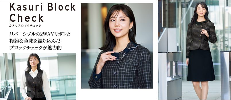 (6)カルゼ調をベースに爽やかなサックスのチェック柄が映える女性らしさ漂うベスト。同色系のリボンブラウスと合わせることによって親しみやすさを醸し出すことができます。